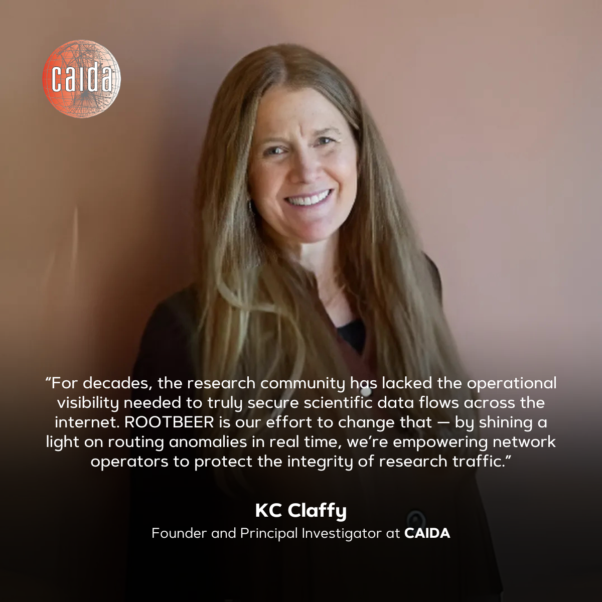 “For decades, the research community has lacked the operational visibility needed to truly secure scientific data flows across the internet. ROOTBEER is our effort to change that — by shining a light on routing anomalies in real time, we’re empowering network operators to protect the integrity of research traffic.” KC Claffy, Founder and Principal Investigator, CAIDA