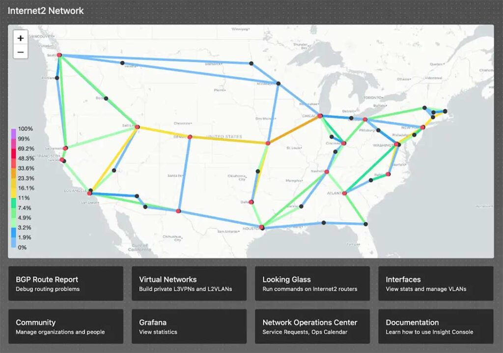 View your interfaces with the Internet2 Platform, Cloud Connect, and Rapid Private Interconnect. Inspect interface statistics and delegate VLANs to other organizations.
